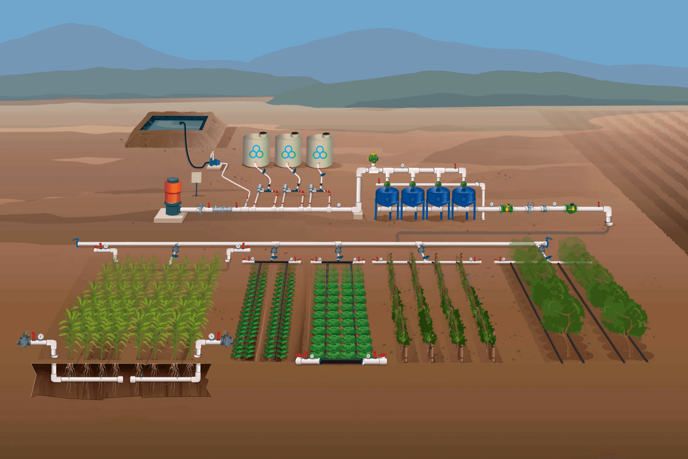 Благодаря высокому профессионализму и квалифицированному инженерному составу наша компания стала ведущей в Казахстане по внедрению систем капельного и дождевального орошения в интенсивном садоводстве, овощеводстве, выращивания кукурузы, люцерны и других кормовых культур, что позволило нам быть надежным партнером для отдельных фермеров и больших агрохолдингов.